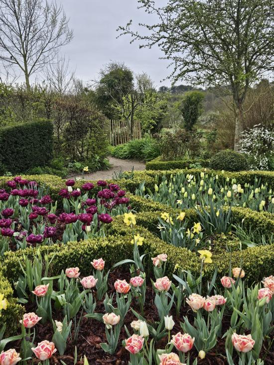 Festival de couleurs dans les parterres de buis. C’est un démarrage de saison éclatant dans les jardins du château, avec en tête d’affiche les tulipes « Foxy foxtrot » et « Alison Bradley ». Ces variétés doubles et bigarrées arborent des teintes qui évoluent jour après jour. Une composition florale, sous forme de collection, à découvrir sans plus attendre J