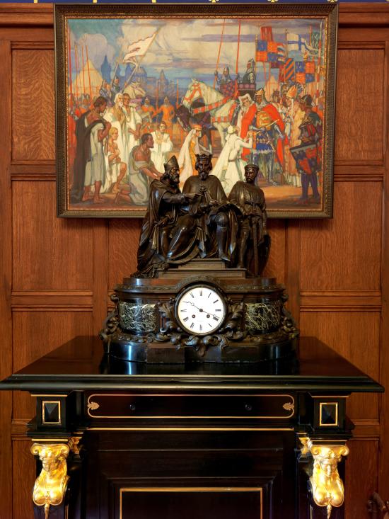 Pendule "Jean-sans-Terre signant la Magna Carta", bronze et marbre vert, collections départementales du Pas-de-Calais, château d'Hardelot
