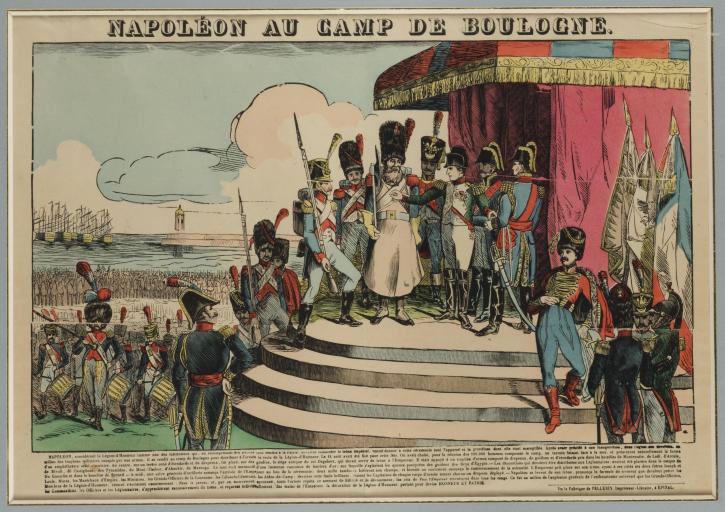 Durant les deux années que durent le camp de Boulogne, Napoléon vient régulièrement voir ses hommes et assister aux manœuvres. Il loge souvent au château de Pont-de-Briques mais aussi dans ce qu’on appelle, depuis son passage, la maison impériale à Boulogne-sur-Mer. Il y signe des décrets (plus de 1000) et récompense aussi ses soldats. Le 16 août 1804, il remet à plus de 2000 soldats et civils la médaille de la Légion d’honneur, qu’il a créée deux ans auparavant. C’est cette scène qui est représentée sur cette image d’Epinal. Comme toutes les images produites par l’imagerie Pellerin, les personnages sont représentés de trois quarts, les couleurs sont vives et les traits simples. Napoléon est au centre de la composition en train de décorer de la Légion d’honneur le soldat face à lui. Une dizaine d’hommes l’entourent directement. Ils se tiennent tous devant la tente impériale. En contrebas, on distingue un orchestre rythmant la remise des décorations. Derrière eux, les troupes et les navires sont rassemblés dans le port. L’arrière-plan est dominé par la jetée du port de Boulogne, la mer et le ciel.